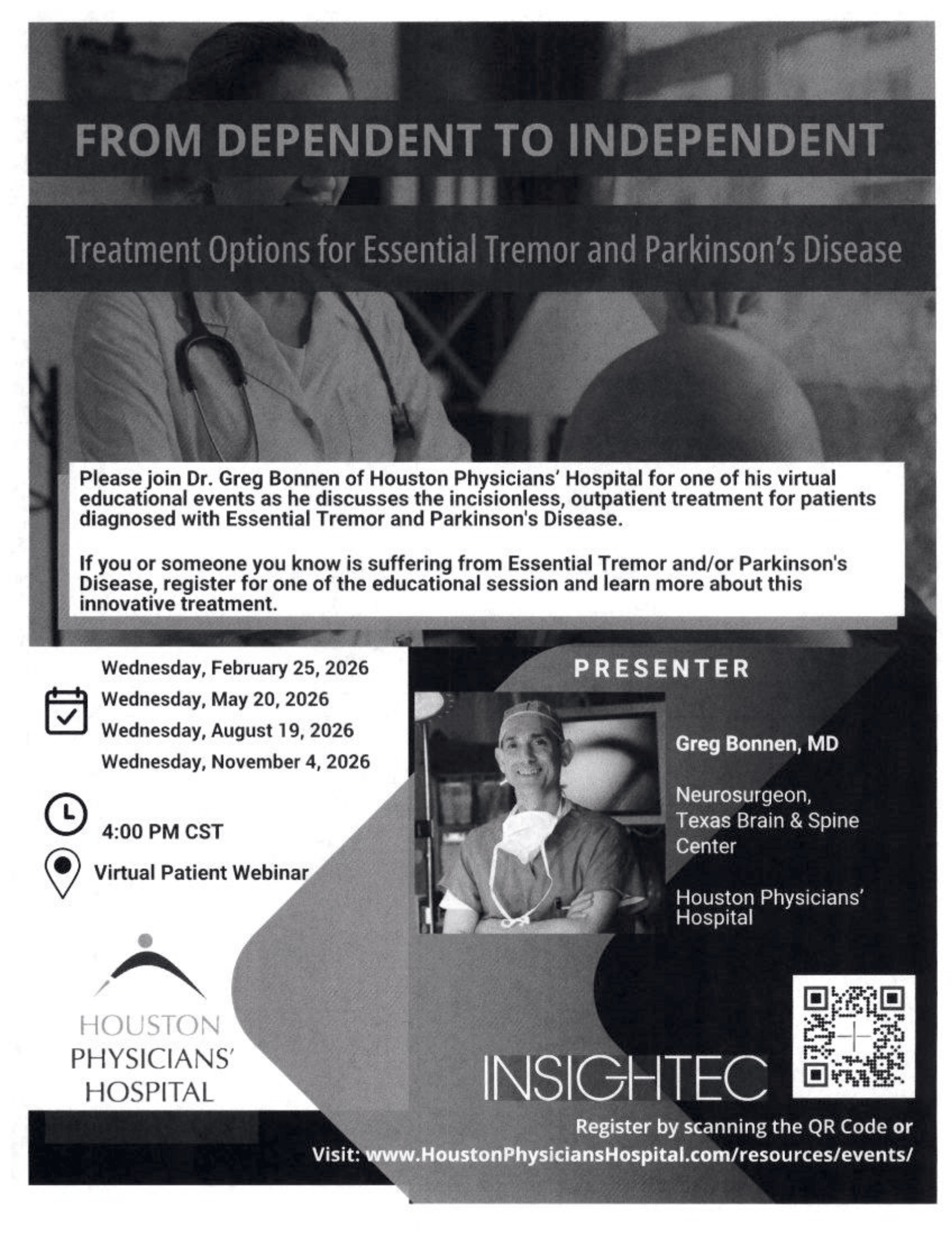 Dr. Bonnen will be hosting four virtual webinars this year on treatment options for Essential Tremor and/or Parkinson’s disease—don’t miss out! Check the flyer below for more info, dates and registration details.